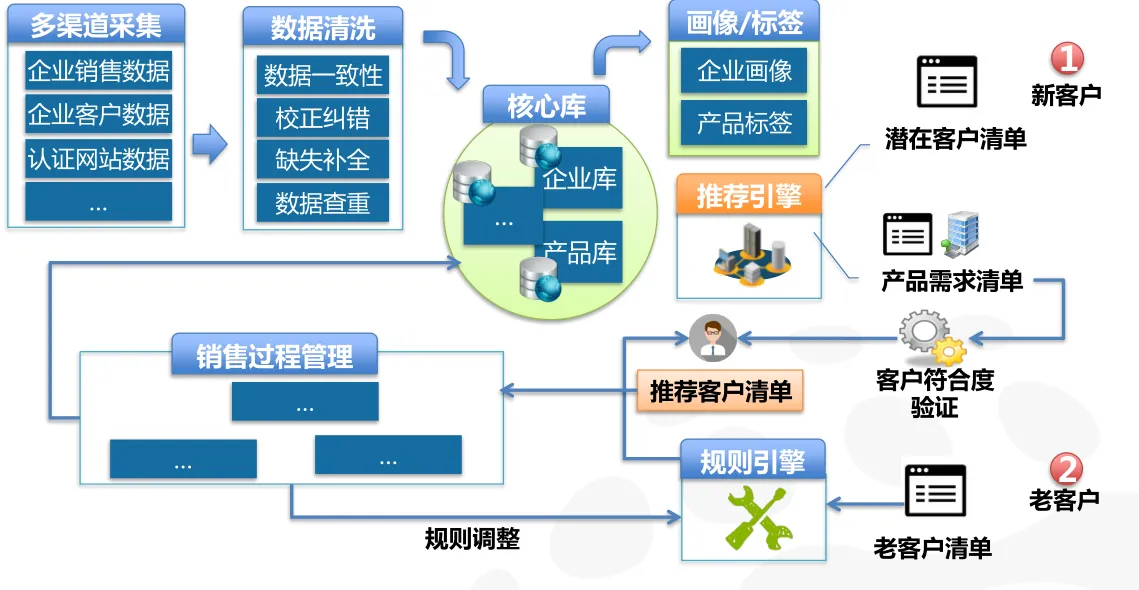 从使用产品的客户角度来讲,这其实是一个很简化的过程,客户只要知道我们提供的初始化数据,怎么推荐更加精准,而不需要管实现过程。我们会为企业推荐潜在客户清单,根据老客户采购周期和采购行为来推荐。我们前期做的数据采集工作,数据清洗工作和形成核心的企业库、产品库,再到最后生成企业画像、产品标签,这是我们前期使用个性化引擎需要自己做的事情。另外,关于推荐效果的闭环管理,当你推荐成功客户清单,我会把你放到销售过程中做一个检验,再把结果数据进行反馈,最后对个性化推荐做调优。