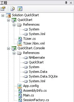 首先要添加Nhibernate和QuickStart的引用。添另一个App.config文件作为程序的配置文件,这样的话在编译完后可以自动在bin目录下生成QuickStart.Console.config文件。Nhibernate的配置信息全部可以放在App.config中,配置文件的具体内容