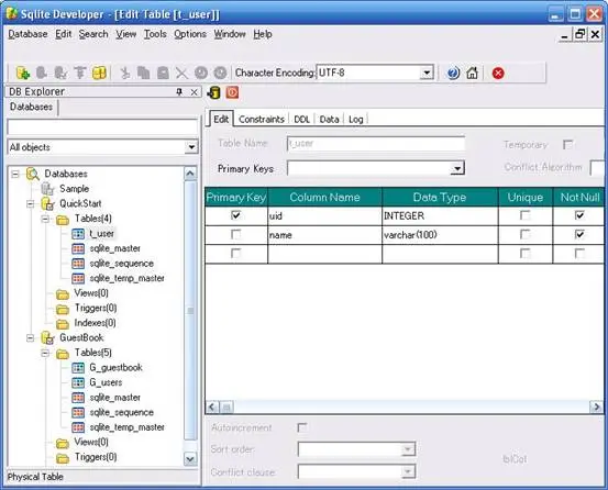 新建数据库(这里推荐一大家一个很好用的用来管理SQLite数据库的工具SQLite Developer你可以从http://www.sharpplus.com/免费下载它。不然的话你会被SQLite Console下建立和修改数据库的过程给烦死。)