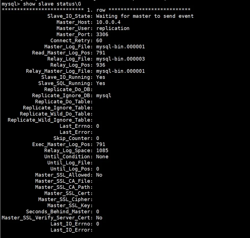 change master to master_host='10.0.0.4', master_port=3306, master_user='replication', master_password='replication';start slave;