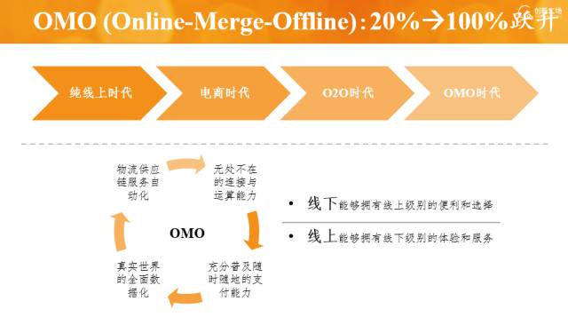 OMO即Online-Merge-Offline,是线上线下的全面整合,线上线下的边界消失。
