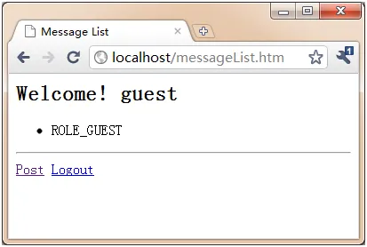 可以看到,现在的角色是ROLE_GUEST,那么就直接看到,没有验证身份,若我们要发布消息呢,点击Post链接,看看效果: