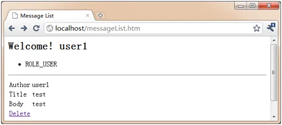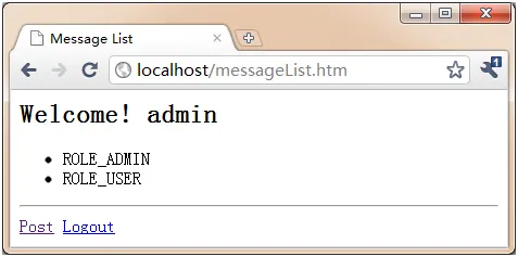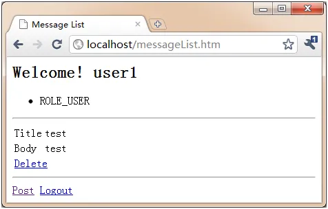 下面发布消息,之后能看到消息的列表了,这对ROLE_USER的角色都是可以查看的。