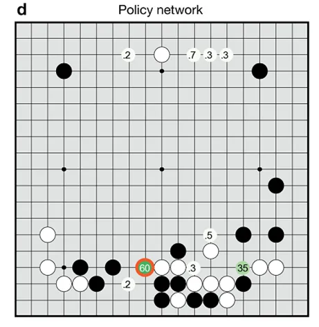 AlphaGo没有进行直接的形势判断,就是没有直接学习value net,而是先做一个选点(policy net)程序。选点可以认为是一个时序(走棋)的一个局部问题,就是从当前局面大概判断,有哪几步可能走,暂时不需要推演(那是模拟的工作)。棋手的选点是会推演的,这里的基础policy net是不推演的,前已经看到AlphaGo线上模拟中选点(Q+u)是有推演的。