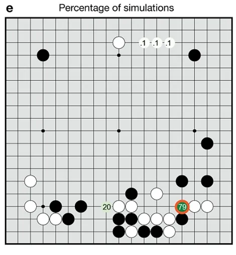 根据以上的函数可知,模拟次数最多一步,其实就是在多次模拟中,AlphaGo认为那一步最可能赢的次数的累加(或平均,除以总模拟次数)。