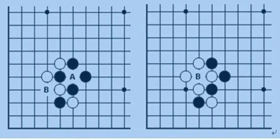 打劫,是指黑白双方都把对方的棋子围住,这种局面下,如果轮白下,可以吃掉一个黑子;如果轮黑下,同样可以吃掉一个白子。因为如此往复就形成循环无解,所以围棋禁止“同形重复”。根据规则规定“提”一子后,对方在可以回提的情况下不能马上回提,要先在别处下一着,待对方应一手之后再回“提”。如图中的情况: