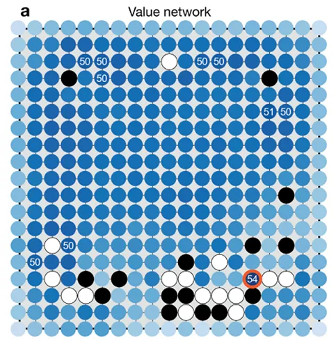 在讲value的原理前,先看看定性看看value的结果。如图,这是AlphaGo用value net预测的走下一步,她赢的概率。空的地方都被蓝色标示了,越深说明AlphaGo赢的概率越高。这和我们学的棋理是相符的,在没有战斗时,1,2线(靠边的地方)和中间的概率都低,因为它们效率不高。而且大多数地方的概率都接近50%。所以说赢棋难,输棋也很难。这当然排除双方激烈战斗的情况。