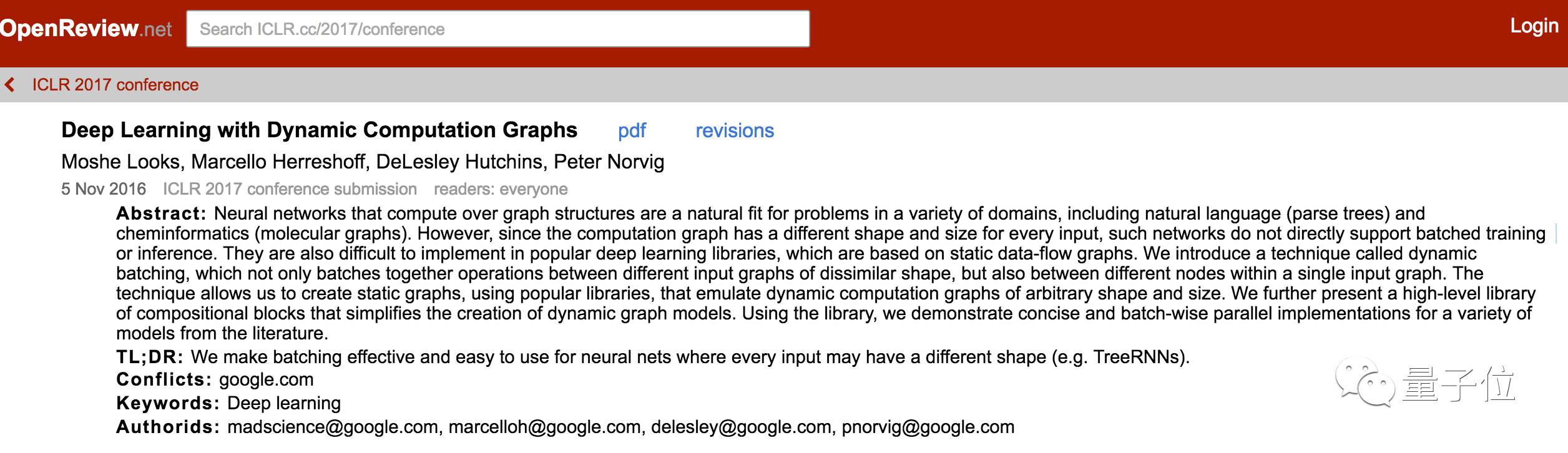 “追上来”这种说法可能并不准确,在查看TensorFlow动态计算图的论文时,『量子位』发现这篇论文向ICLR提交的时间是2016年11月5日,比PyTorch发布还早了两个多月。可见“动态”是个好东西,它所带来的易用性,每个框架都想早早拥有。