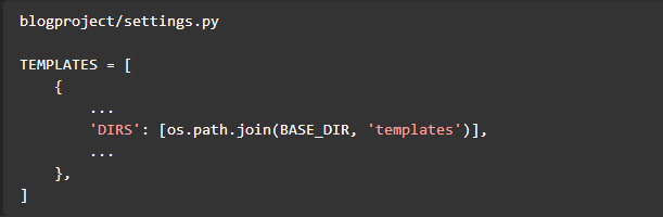 其中 DIRS 就是设置模板的路径,在 [] 中写入 os.path.join(BASE_DIR, 'templates'),变成这样: