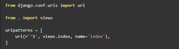 我们首先从 django.conf.urls 导入了 url 函数,又从当前目录下导入了 views 模块。然后我们把网址和处理函数的关系写在了 urlpatterns 列表里。绑定关系的写法是把网址和对应的处理函数作为参数传给 url 函数(第一个参数是网址,第二个参数是处理函数),另外我们还传递了另外一个参数 name,这个参数的值将作为处理函数 index 的别名,这在以后会用到。
