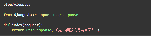 我们前面说过,Web 服务器的作用就是接收来自用户的 http 请求,根据请求内容作出相应的处理,并把处理结果包装成 http 响应返回给用户。这个两行的函数体现了这个过程。它首先接受了一个名为 request 的参数,这个 request 就是 django 为我们封装好的 http 请求,它是类 HttpResponse 的一个实例。然后我们便直接返回了一个 http 响应给用户,这个 http 响应也是 django 帮我们封装好的,它是类 HttpResponse 的一个实例,只是我们给它传了一个自定义的字符串,用户接受到这个响应后就会在浏览器显示出我们传递的内容:“欢迎访问我的博客首页!”
