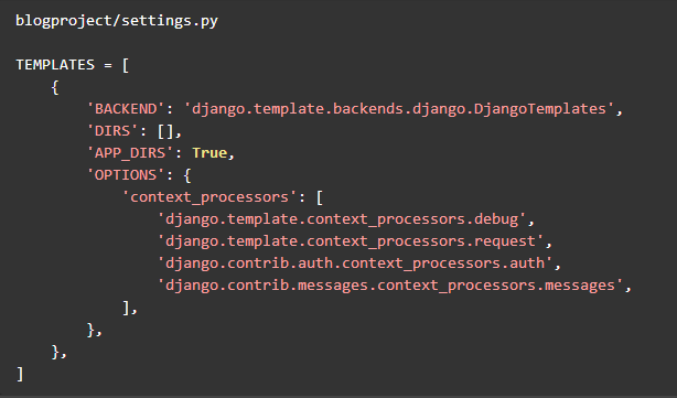 这里 BASE_DIR 是 settings.py 前面定义的变量,记录的是工程根目录 blogproject 的值,在这个目录下有我们的模板目录 templates,于是利用os.path.join 把这两个路径连起来,构成完整的模板路径,django 就知道去这个路径下面找我们的模板了。
