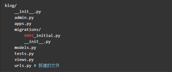 首先 django 需要知道当用户访问不同的网址时,应该如何处理不同的网址。django 的做法是把不同的网址对应的处理函数写在一个 urls.py 文件里,当用户访问某个网址时,django 就去会这个文件里找,如果找到这个网址,就会调用和它绑定在一起的处理函数(叫做视图函数),下面是具体的做法,首先在 blog 应用的目录下创建一个 urls.py 文件,这时你的目录看起来是这样: