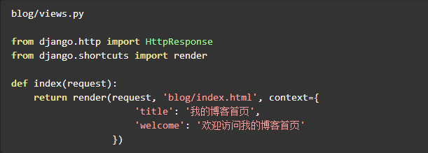 这里我们在是直接把字符串传给 HttpResponse 了,而是调用 django 提供了 render 函数,这个函数根据我们传入的参数来构造 HttpResponse。我们首先把 http 请求传了进去,然后它根据第二个参数的值 blog/index.html 找到我们的模板,然后读取模板中的内容,并且根据我们传入的 context 把模板中的变量替换为我们传递的值,{{ title }} 被替换成了 context 字典中 title 对应的值,同理 {{ welcome }} 也被替换成相应的值。最终,我们的 html 模板中的内容字符串被传递给 HttpResponse 对象并返回给浏览器,这样用户的浏览器上便显示出了我们写的 html 模板的内容。