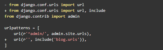 这里 - 表示删掉这一行,+ 表示添加这一行。我们这里导入了一个 include 函数,然后利用这个函数把 blog 应用下的 urls.py 包含了进来。此外 include 前还有一个 r'',这是一个空字符串,这里也可以写其他字符串,django 会把这个字符串和后面 include 的 urls.py 文件中的 url 拼接。假如我们这里把 r'' 改成 r'blog/',而我们在 blog.urls 中写的url 是 r'^$',一个空字符串,那么 django 最终匹配的就是 blog/ 加上一个空字符串,即 blog/。
