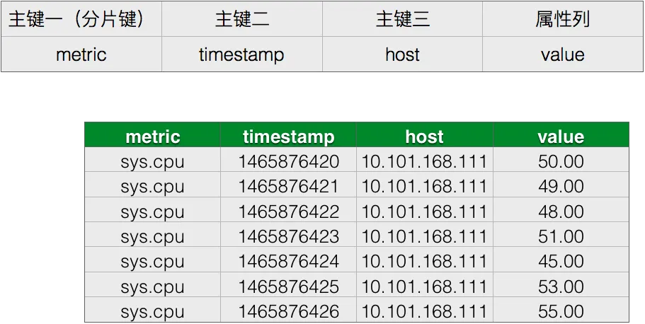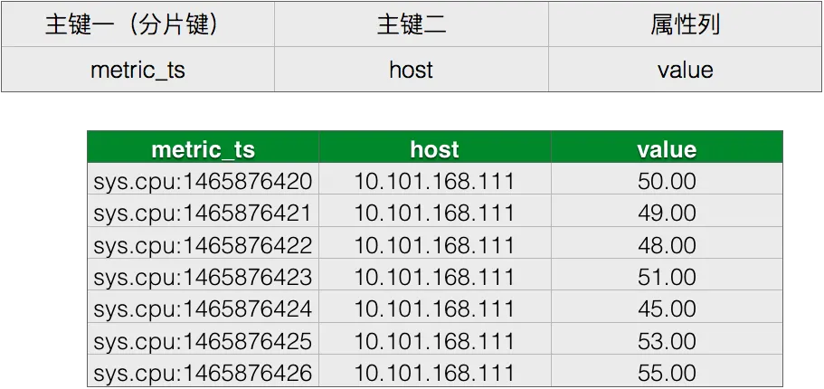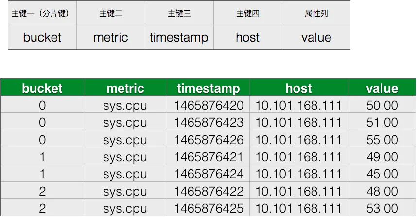 该设计以metric列为分片键,能够满足查询的场景,但是有很严重的分片热点问题。假设一个metric下每秒采集一个点,而我们有上百台设备,则该分片每秒需要能够提供上百的写入能力,这点也没有问题。但是由于使用了metric作为分片键,metric的值为常量,随着数据量的上涨,其无法再进行分裂,会导致该分片下的数据量不断膨胀,可能超过一台物理机所能承受的上限,存在分片数据量的热点。