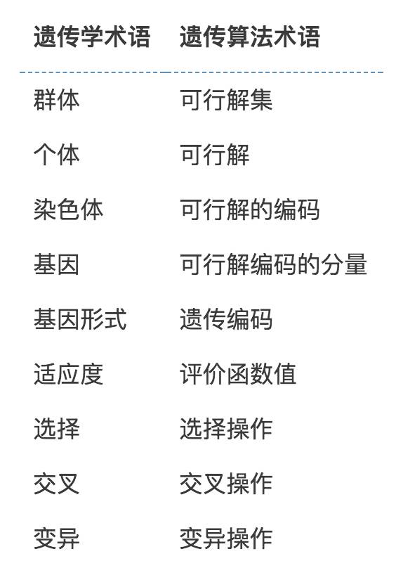 简单而言,遗传算法使用群体搜索技术,将种群代表一组问题的可行解,通过对当前种群施加选择,交叉,变异等一些列遗传操作来产生新一代的种群,并逐步是种群进化到包含近似全局最优解的状态。下面我将遗传学和遗传算法相关术语的对应关系总结一下: