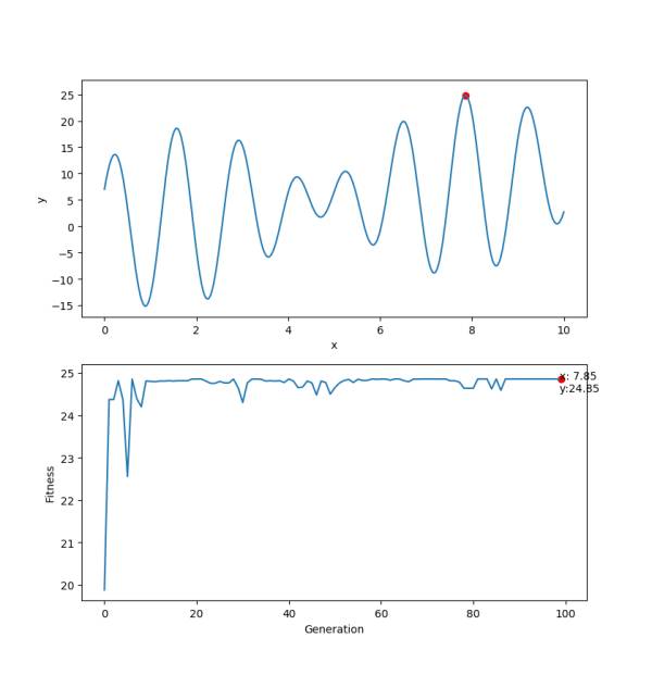 绘制一下函数本身的曲线和我们使用遗传算法得到的进化曲线: