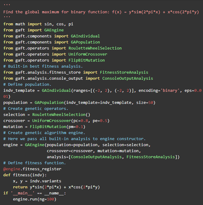 最近需要用到遗传算法来优化一些东西,最初是打算直接基于某些算法实现一个简单的函数来优化,但是感觉单纯写个非通用的函数运行后期改进算子或者别人使用起来都会带来困难,同时遗传算法基本概念和运行流程相对固定,改进也一般通过编码机制,选择策略,交叉变异算子以及参数设计等方面,对于算法的整体结构并没有大的影响。这样对于遗传算法来说,就非常适合写个相对固定的框架然后给算子、参数等留出空间以便对新算法进行测试和改进。于是就动手写了个遗传算法的小框架gaft,本文对此框架进行一些介绍并分别以一个一维搜索和二维搜索为例子对使用方法进行了介绍。