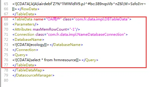 通过EditPlus编辑器打开datasource.xml文件后,找到“OA用户”这块xml代码。将这块代码复制到服务器上的datasource.xml上,路径和/WebReport/WEB-INF/resourcr/datasource.xml,粘贴格式参见本地的开发环境。如下图: