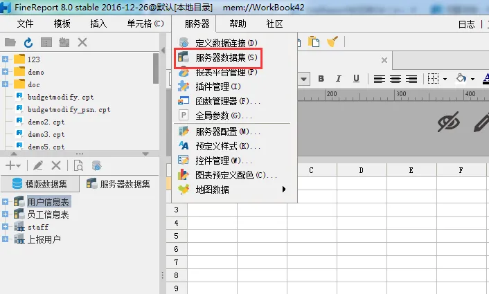 服务器数据集:服务器数据集是需要去帆软报表的开发工具上进行配置。如下图: