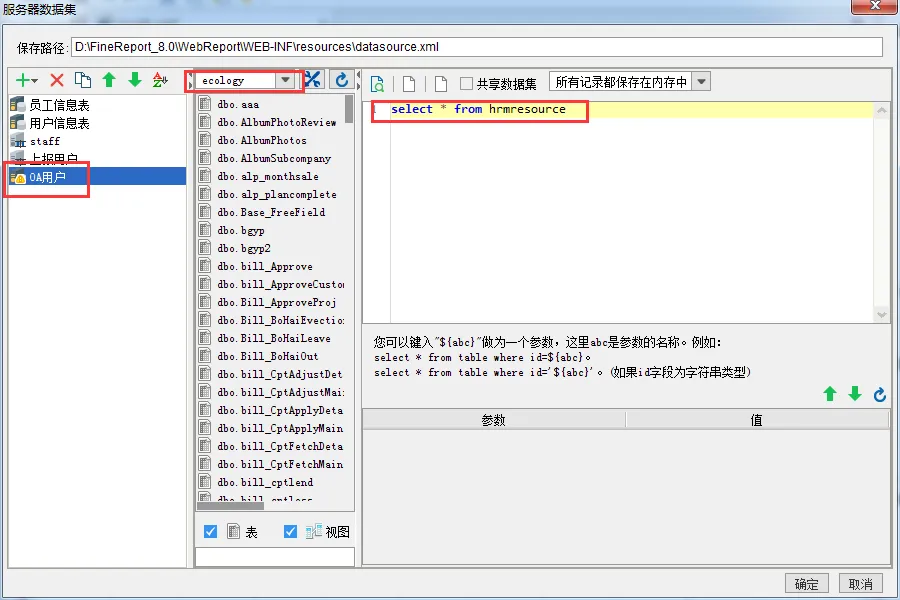 进入设计器,点击菜单服务器-服务器数据集,新增一个数据集,选择OA的数据源,写入SQL“select * from hrmresource”,保存即可。