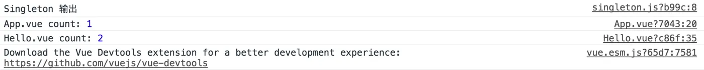 import Singleton from '../js/singleton' export default { …… created(){ Singleton.addCount(); console.log('Hello.vue count:', Singleton.count); } }
