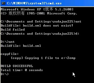 【说明ant安装成功!因为ant默认运行build.xml文件,这个文件需要我们建立。】