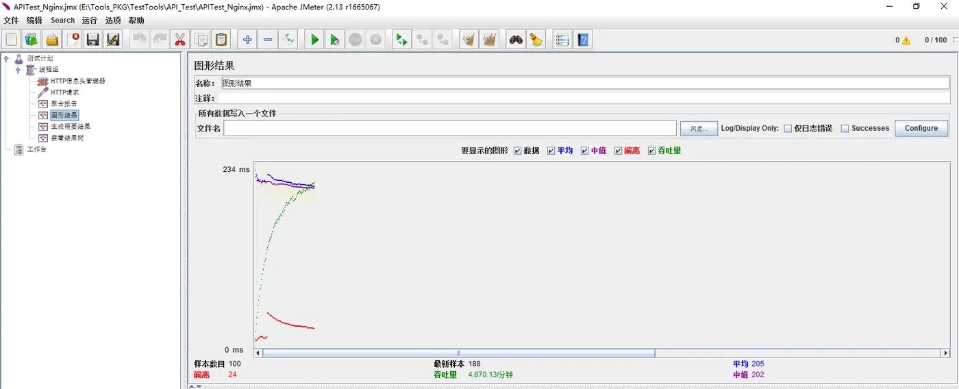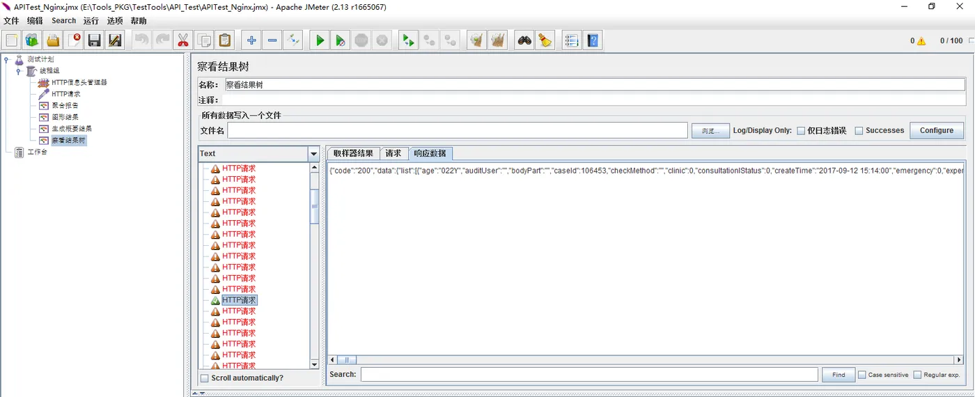<?xml version="1.0" encoding="UTF-8"?> <jmeterTestPlan version="1.2" properties="2.8" jmeter="2.13 r1665067"> <hashTree> <TestPlan guiclass="TestPlanGui" testclass="TestPlan" testname="测试计划" enabled="true"> <stringProp name="TestPlan.comments"></stringProp> <boolProp name="TestPlan.functional_mode">false</boolProp> <boolProp name="TestPlan.serialize_threadgroups">false</boolProp> <elementProp name="TestPlan.user_defined_variables" elementType="Arguments" guiclass="ArgumentsPanel" testclass="Arguments" testname="用户定义的变量" enabled="true"> <collectionProp name="Arguments.arguments"/> </elementProp> <stringProp name="TestPlan.user_define_classpath"></stringProp> </TestPlan> <hashTree> <ThreadGroup guiclass="ThreadGroupGui" testclass="ThreadGroup" testname="线程组" enabled="true"> <stringProp name="ThreadGroup.on_sample_error">continue</stringProp> <elementProp name="ThreadGroup.main_controller" elementType="LoopController" guiclass="LoopControlPanel" testclass="LoopController" testname="循环控制器" enabled="true"> <boolProp name="LoopController.continue_forever">false</boolProp> <stringProp name="LoopController.loops">1</stringProp> </elementProp> <stringProp name="ThreadGroup.num_threads">100</stringProp> <stringProp name="ThreadGroup.ramp_time">1</stringProp> <longProp name="ThreadGroup.start_time">1505206849000</longProp> <longProp name="ThreadGroup.end_time">1505206849000</longProp> <boolProp name="ThreadGroup.scheduler">false</boolProp> <stringProp name="ThreadGroup.duration"></stringProp> <stringProp name="ThreadGroup.delay"></stringProp> </ThreadGroup> <hashTree> <HeaderManager guiclass="HeaderPanel" testclass="HeaderManager" testname="HTTP信息头管理器" enabled="true"> <collectionProp name="HeaderManager.headers"> <elementProp name="" elementType="Header"> <stringProp name="Header.name">SESSIONID</stringProp> <stringProp name="Header.value">E13F76A3626BB79833E97EDE6C2D8669</stringProp> </elementProp> </collectionProp> </HeaderManager> <hashTree/> <HTTPSamplerProxy guiclass="HttpTestSampleGui" testclass="HTTPSamplerProxy" testname="HTTP请求" enabled="true"> <elementProp name="HTTPsampler.Arguments" elementType="Arguments" guiclass="HTTPArgumentsPanel" testclass="Arguments" testname="用户定义的变量" enabled="true"> <collectionProp name="Arguments.arguments"/> </elementProp> <stringProp name="HTTPSampler.domain"></stringProp> <stringProp name="HTTPSampler.port"></stringProp> <stringProp name="HTTPSampler.connect_timeout"></stringProp> <stringProp name="HTTPSampler.response_timeout"></stringProp> <stringProp name="HTTPSampler.protocol"></stringProp> <stringProp name="HTTPSampler.contentEncoding"></stringProp> <stringProp name="HTTPSampler.path">https://test.lifeccp.com/portal/tasks/menuTask?createEnd=2017-09-12&createFrom=2017-09-05&currentPage=1&currentSize=15&hospitalId=3&st=0&st=1&st=2&st=3&st=4</stringProp> <stringProp name="HTTPSampler.method">GET</stringProp> <boolProp name="HTTPSampler.follow_redirects">true</boolProp> <boolProp name="HTTPSampler.auto_redirects">false</boolProp> <boolProp name="HTTPSampler.use_keepalive">true</boolProp> <boolProp name="HTTPSampler.DO_MULTIPART_POST">false</boolProp> <boolProp name="HTTPSampler.monitor">false</boolProp> <stringProp name="HTTPSampler.embedded_url_re"></stringProp> </HTTPSamplerProxy> <hashTree/> <ResultCollector guiclass="StatVisualizer" testclass="ResultCollector" testname="聚合报告" enabled="true"> <boolProp name="ResultCollector.error_logging">false</boolProp> <objProp> <name>saveConfig</name> <value class="SampleSaveConfiguration"> <time>true</time> <latency>true</latency> <timestamp>true</timestamp> <success>true</success> <label>true</label> <code>true</code> <message>true</message> <threadName>true</threadName> <dataType>true</dataType> <encoding>false</encoding> <assertions>true</assertions> <subresults>true</subresults> <responseData>false</responseData> <samplerData>false</samplerData> <xml>false</xml> <fieldNames>false</fieldNames> <responseHeaders>false</responseHeaders> <requestHeaders>false</requestHeaders> <responseDataOnError>false</responseDataOnError> <saveAssertionResultsFailureMessage>false</saveAssertionResultsFailureMessage> <assertionsResultsToSave>0</assertionsResultsToSave> <bytes>true</bytes> <threadCounts>true</threadCounts> </value> </objProp> <stringProp name="filename"></stringProp> </ResultCollector> <hashTree/> <ResultCollector guiclass="GraphVisualizer" testclass="ResultCollector" testname="图形结果" enabled="true"> <boolProp name="ResultCollector.error_logging">false</boolProp> <objProp> <name>saveConfig</name> <value class="SampleSaveConfiguration"> <time>true</time> <latency>true</latency> <timestamp>true</timestamp> <success>true</success> <label>true</label> <code>true</code> <message>true</message> <threadName>true</threadName> <dataType>true</dataType> <encoding>false</encoding> <assertions>true</assertions> <subresults>true</subresults> <responseData>false</responseData> <samplerData>false</samplerData> <xml>false</xml> <fieldNames>false</fieldNames> <responseHeaders>false</responseHeaders> <requestHeaders>false</requestHeaders> <responseDataOnError>false</responseDataOnError> <saveAssertionResultsFailureMessage>false</saveAssertionResultsFailureMessage> <assertionsResultsToSave>0</assertionsResultsToSave> <bytes>true</bytes> <threadCounts>true</threadCounts> </value> </objProp> <stringProp name="filename"></stringProp> </ResultCollector> <hashTree/> <Summariser guiclass="SummariserGui" testclass="Summariser" testname="生成概要结果" enabled="true"/> <hashTree/> <ResultCollector guiclass="ViewResultsFullVisualizer" testclass="ResultCollector" testname="察看结果树" enabled="true"> <boolProp name="ResultCollector.error_logging">false</boolProp> <objProp> <name>saveConfig</name> <value class="SampleSaveConfiguration"> <time>true</time> <latency>true</latency> <timestamp>true</timestamp> <success>true</success> <label>true</label> <code