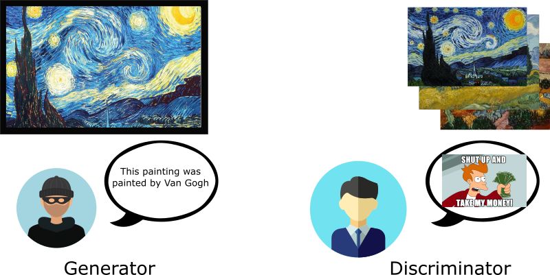 冒牌专家( 即“生成器” )企图模仿梵高的画作生成图片并把它当做真实的梵高作品。