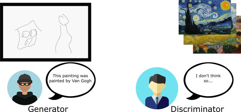 而另一边,艺术专家( 即“分类器” )试图利用它们对梵高画作的了解来识别出赝品( 即生成图片 )。