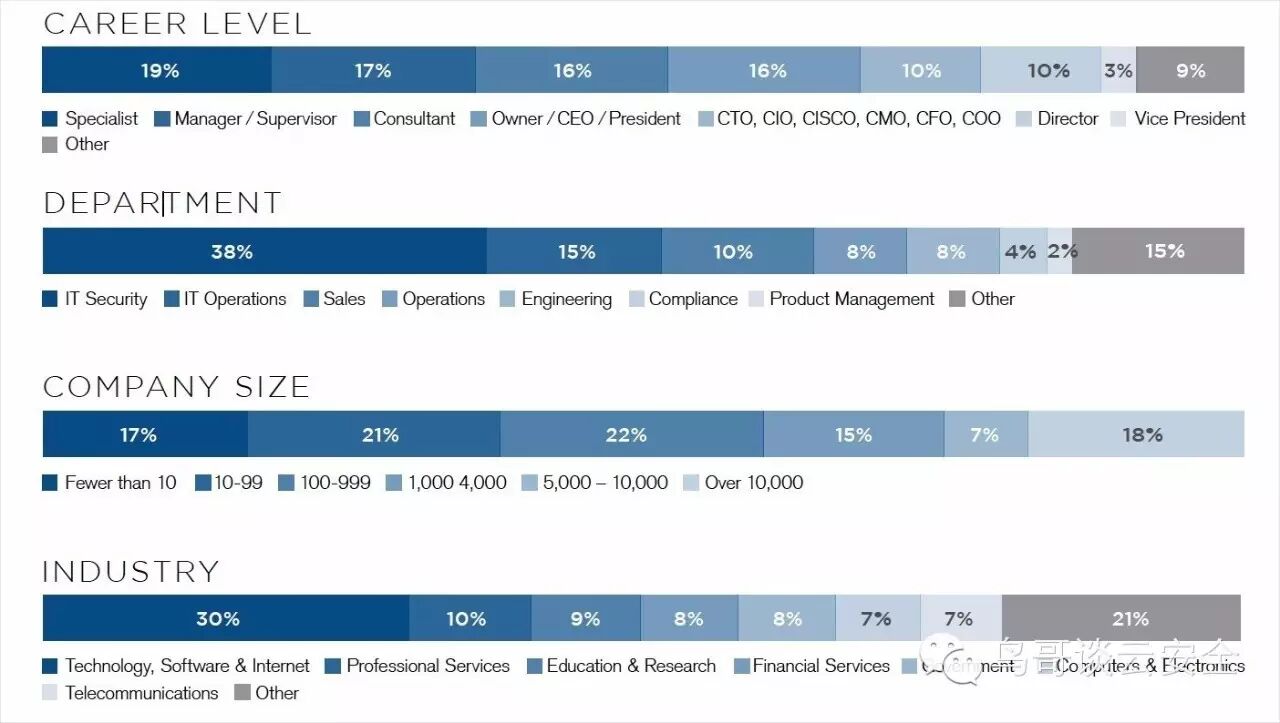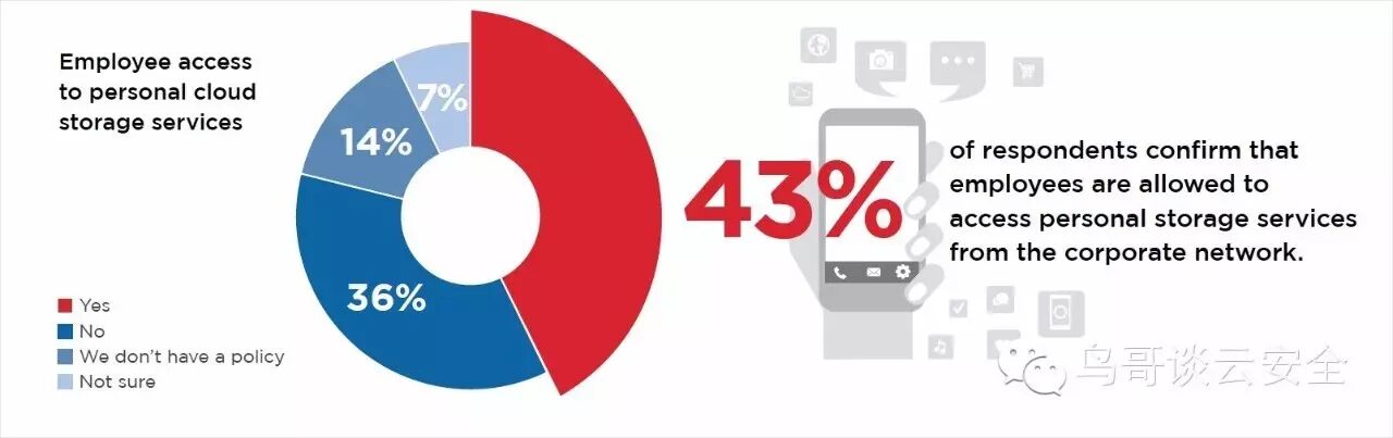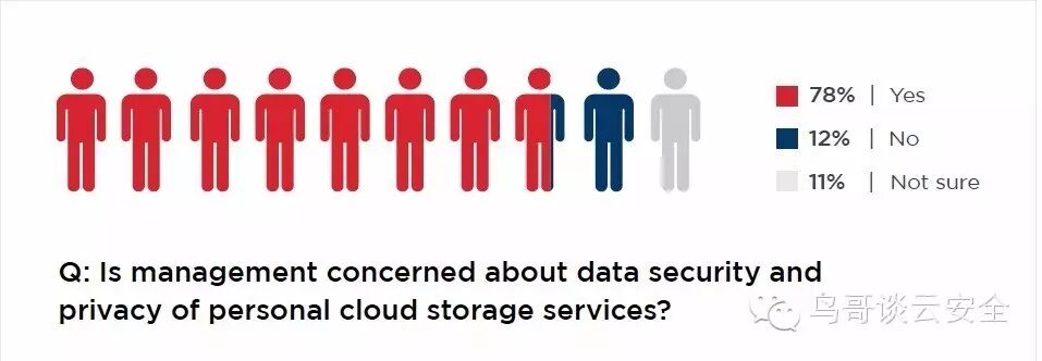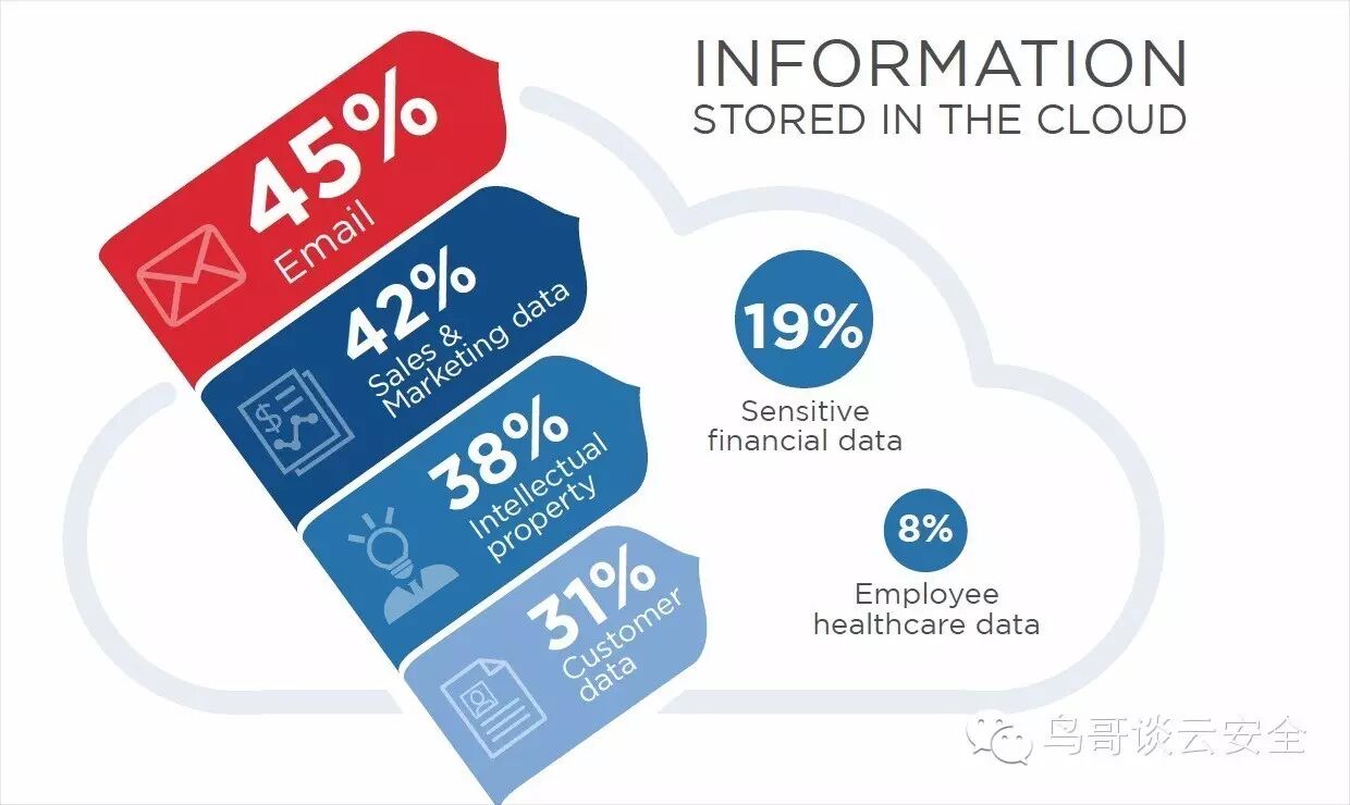 最常见的企业存储信息是email占比45%,其次是销售和营销数据(42%),知识产权(38%)和客户数据(31%)。有很少的公司存储着敏感的财务数据(19%)或者员工的医疗保险数据(8%).
