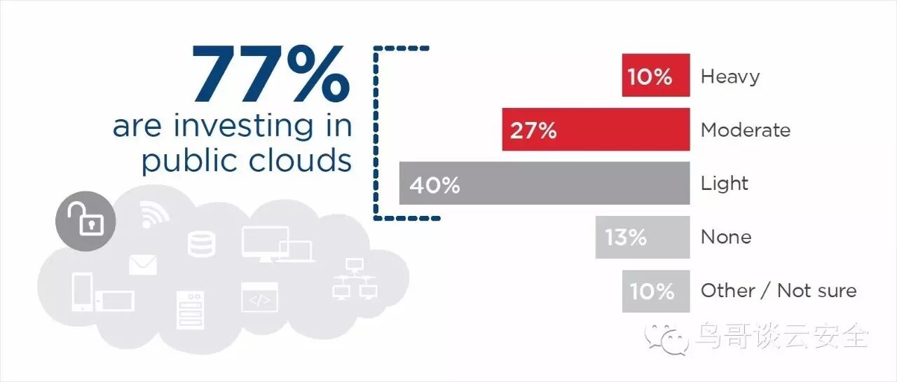 这个问题揭示了企业一个典型的技术应用模式。其中37%的受访者表示自己使用公有云服务是中度和重度使用用户。超过77%的企业已经在公有云上做了一些投入。
