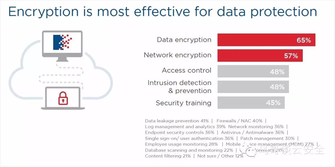 数据加密依然是保障云安全数据安全的最有效的安全访问控制,其中在传输中进行加密占比65%。其他措施包括访问控制占比48%,入侵检测和防御占比48%和安全意识培训占比45%。