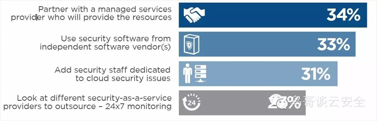 迁移到云上与MSSP合作解决安全需求的企业最高占比34%,使用安全软件解决的占比33%,企业自己进行解决安全风险的占比31%。