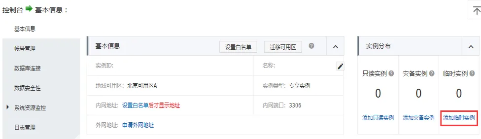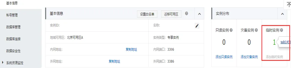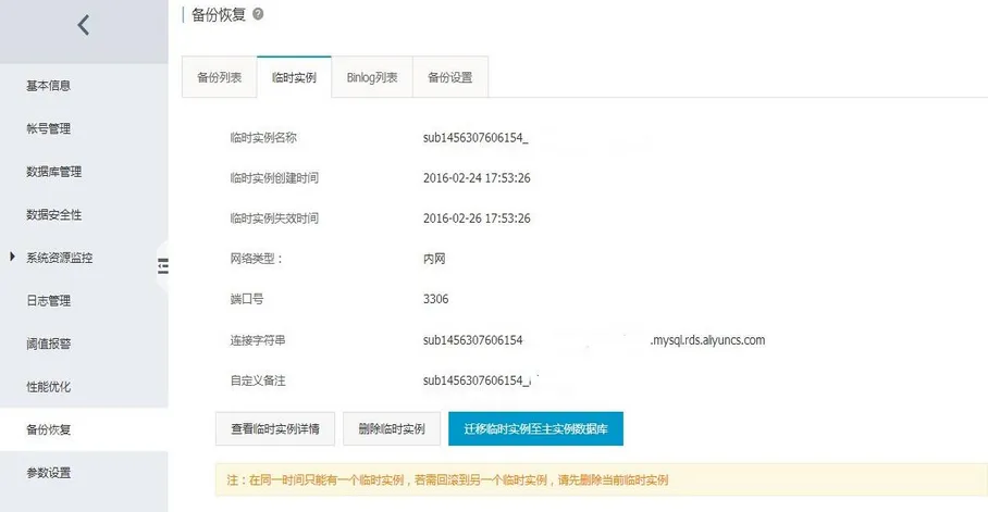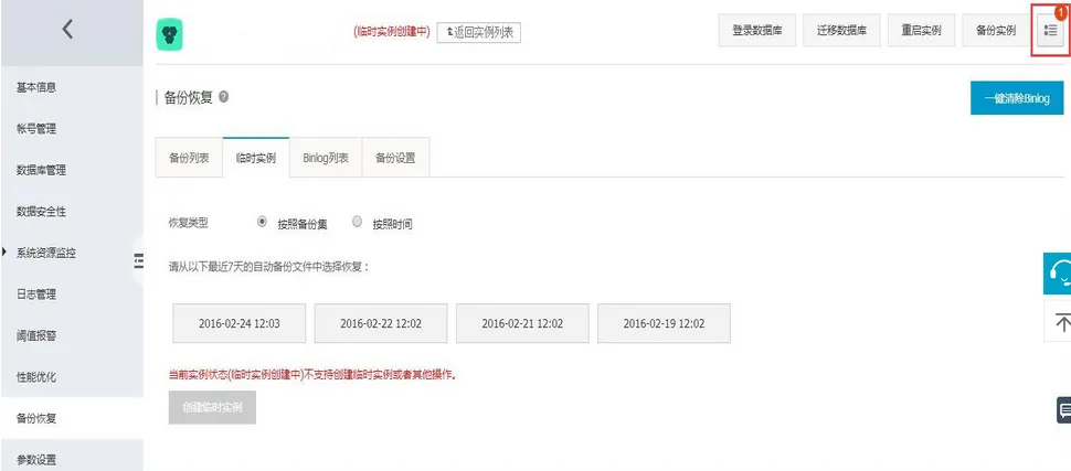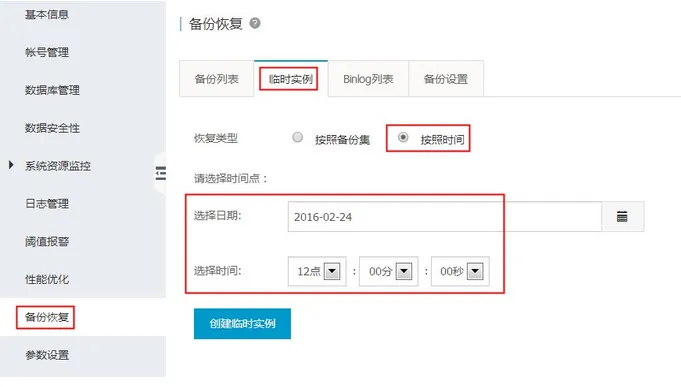 注:创建临时实例有2个条件:1.在该时间点前有全量备份;2.在选择的时间点相邻的两个备份集之间的时间段内没有进行过恢复实例(覆盖性恢复)操作。