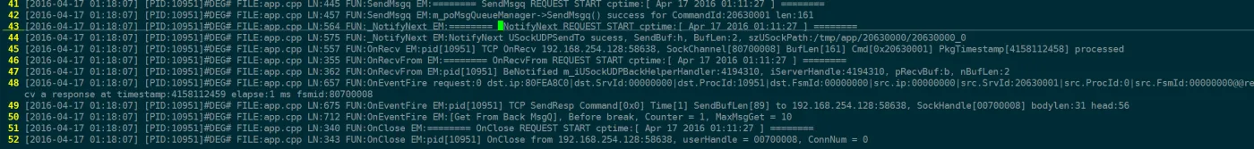 c) OnRecvFrom REQUEST START 这里是接收到了container发来的uinx域 。告诉netio我已经处理完。丢到你的回包消息队列里去了。你赶紧去处理吧