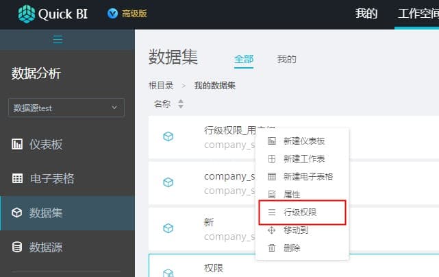 1.切换至数据集列表页,选择目的数据集右键-行级权限: