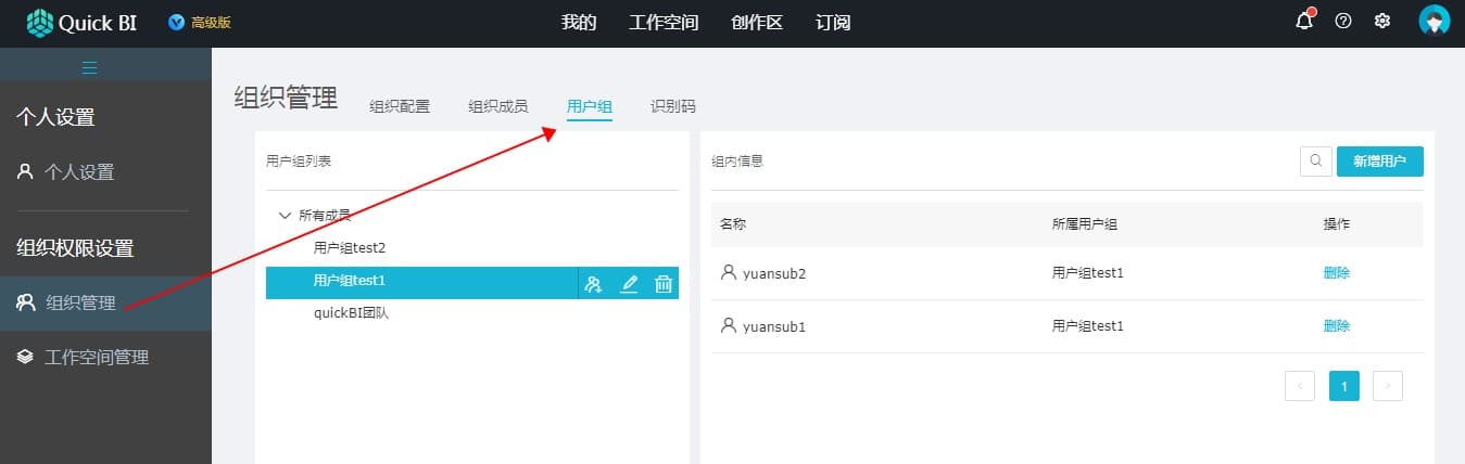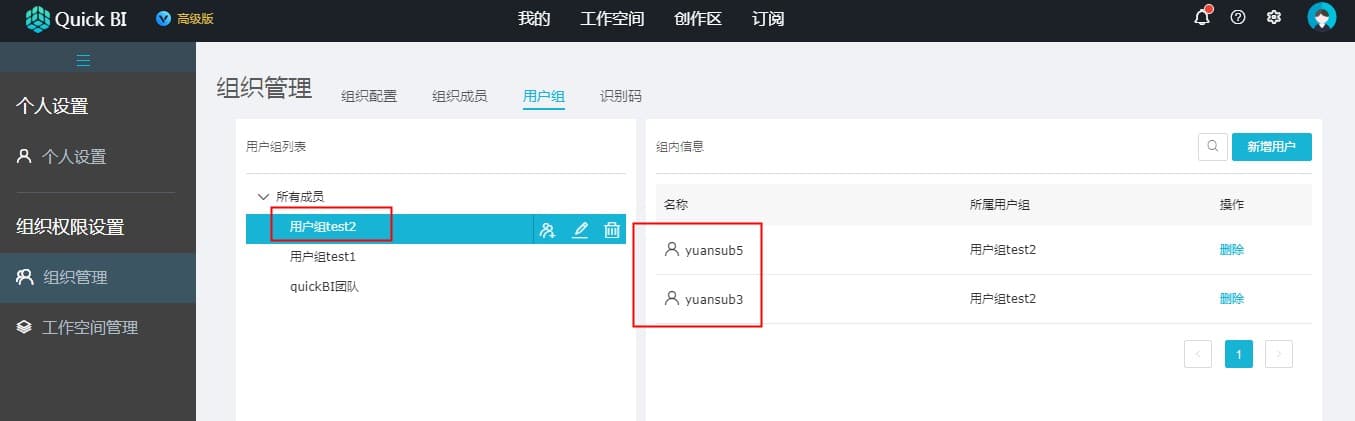 如下图,在组织管理-用户组中新建组,并添加组成员:将yuansub1、yuansub2添加至‘用户组test1’,yuansub3、yuansub5添加至‘用户组test2’: