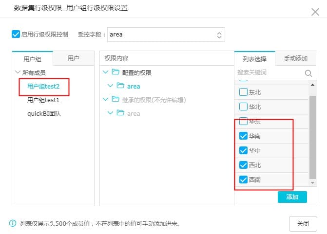 对'用户组test2'设置行级权限:华南、华中、西北和西南区域