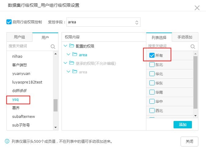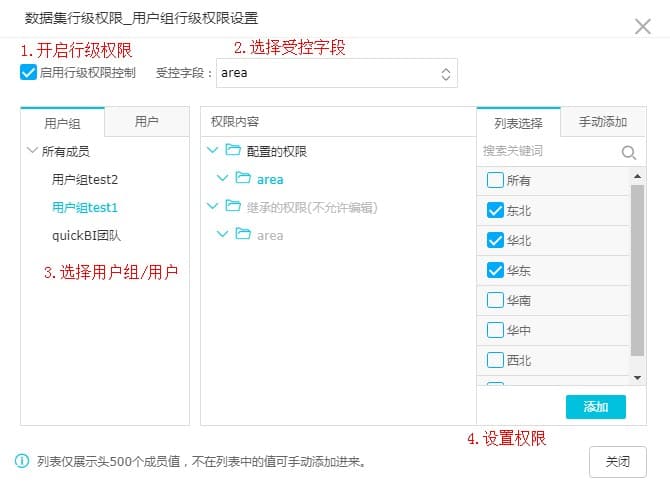 如下图,针对area字段,对‘用户组test1’设置行级权限:东北、华北、华东区域