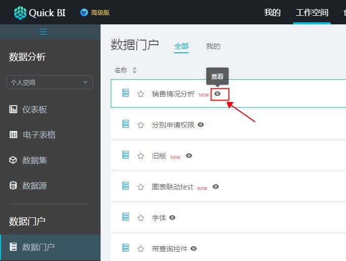 如下图,切换至数据门户列表,点击目标数据门户预览按钮: