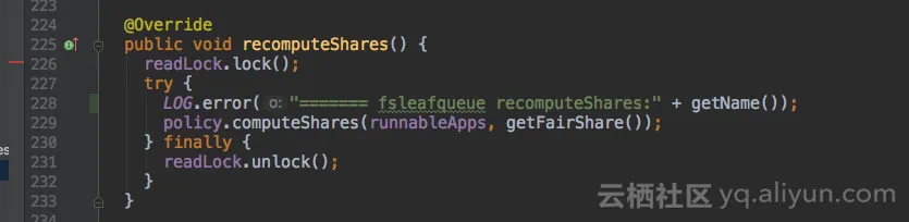 继续加打印,FSLeafQueue类和FSParentQueue类的recomputeShares()方法是重新计算队列内部资源的入口,加打印。