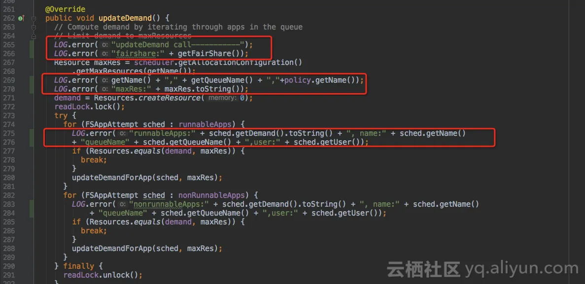 FSLeafQueue类的updateDemand()方法会刷新子队列的资源请求,加打印如图,查看队列实时资源,队列名,调度策略,最大资源,作业信息等。