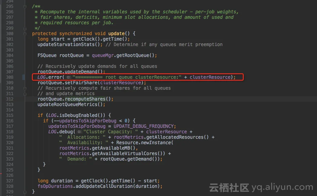 继续加打印,FairScheduler类的update()方法会更新各队列的资源分配,加打印查看root根队列的集群资源。