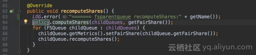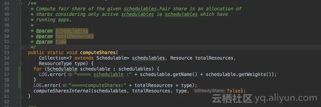 ComputeFairShares类的computeShares()方法会计算队列内部各子队列/作业的资源分配,加打印。