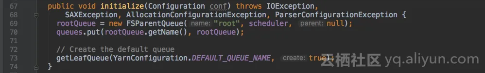QueueManager类的initialize()方法,会用队列默认属性初始化了一个root根队列,和一个root.default子队列。