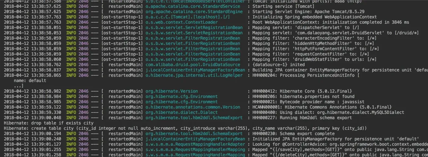 application.properties上半段和整合jpa一点没变,下面加入了一些druid的配置,如果对druid的配置有什么不理解的,可以去网上查一下。(这篇文章我觉得写的很好,传送门)