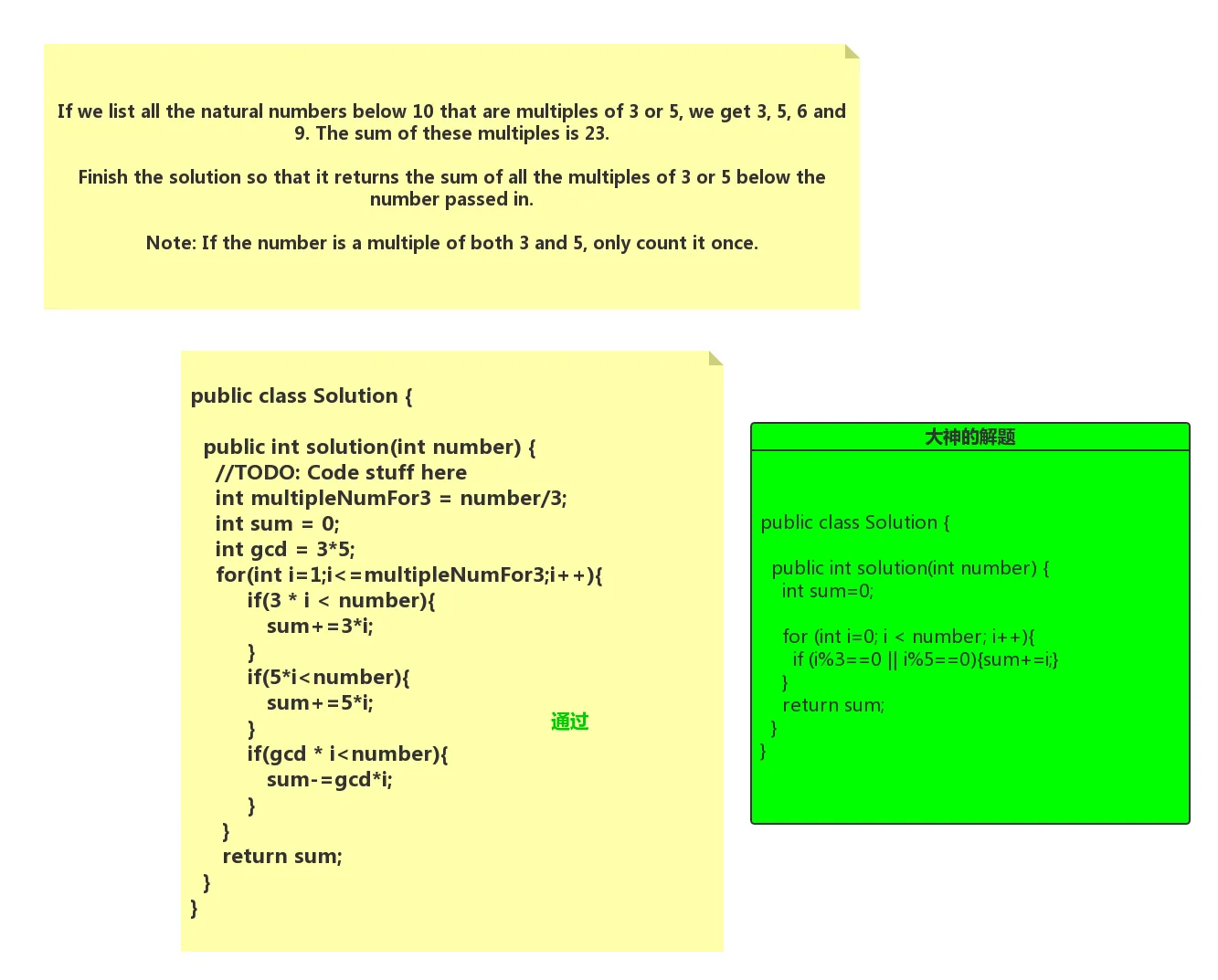 这个题是这样的,方法参数接受一个数值,以3,5为基数,返回小于这个参数的3,5的倍数,加上3,5本身总和.