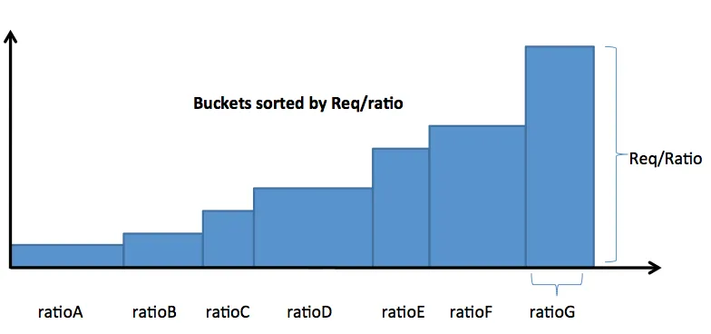 1、将每个用户视为一个盛水的桶,桶的底边是Ratio,面积是Request, 高既是用户的资源饱和度Req/Ratio。分配资源配额的过程就是将水(集群总资源)灌入到各个桶中的过程。将用户按照Req/Ratio进行排序:
